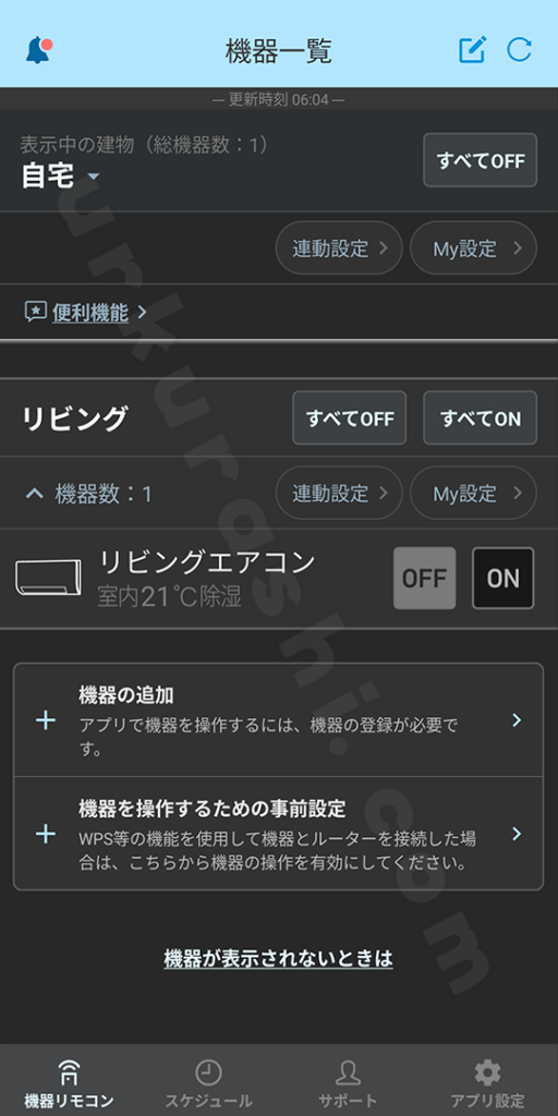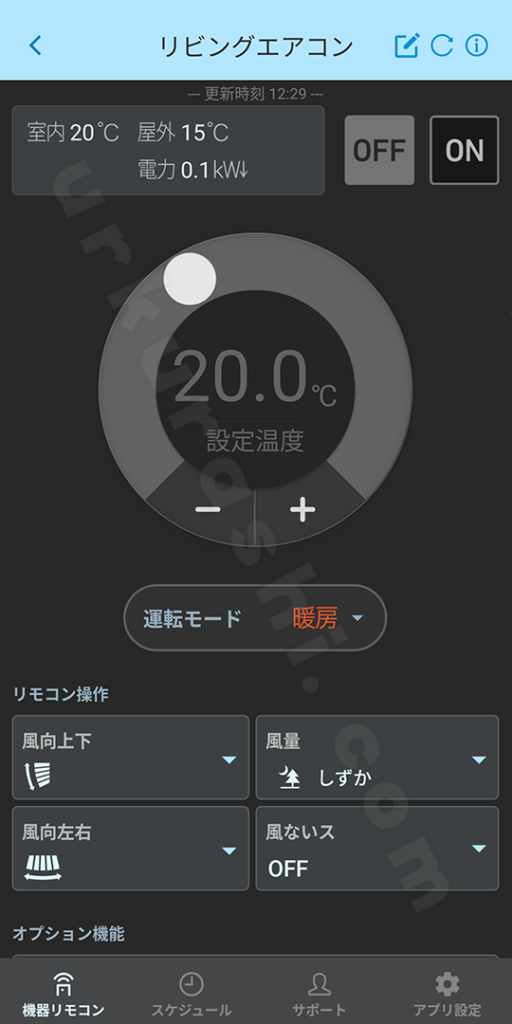 先に紹介したフィルター自動清掃などの細かい機能のON/OFF操作はアプリからはできません。