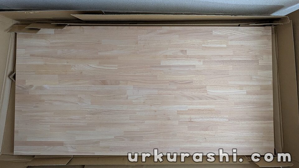 長辺1800mm、短辺800mm、厚み30mmのゴム集成材で、思ったよりも重量がありました。