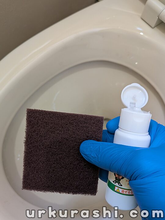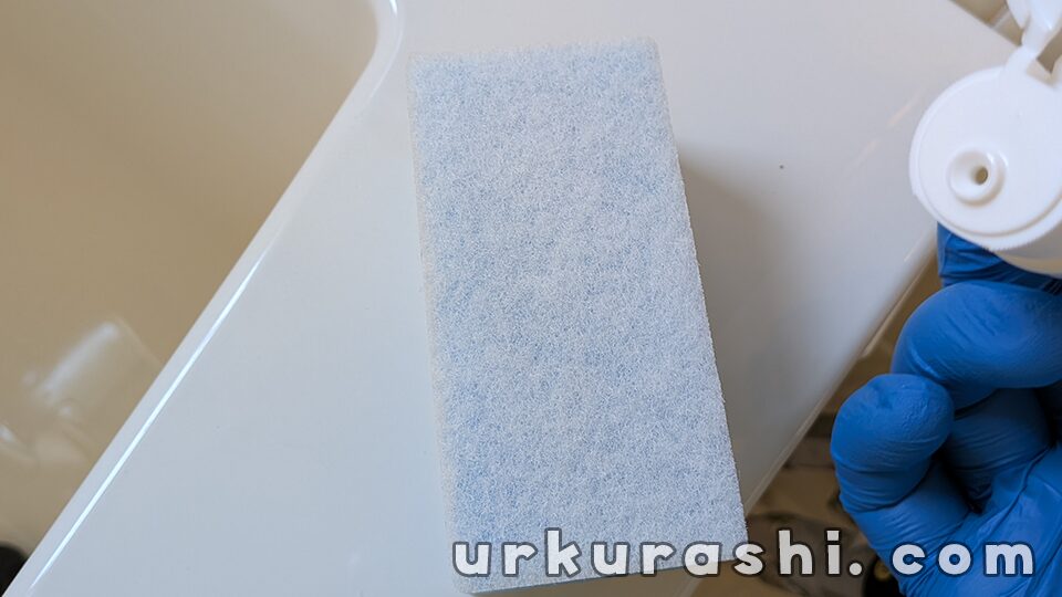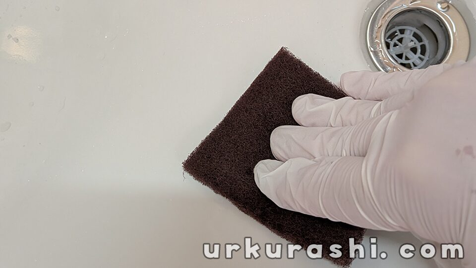 付属の手袋をし、クリーナーとスポンジで磨きます。アルカリ性の研磨剤ですので、手袋は必須です。