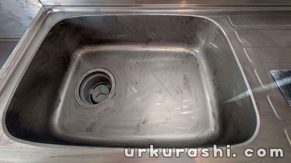 中性洗剤を使ってクリーナー(研磨剤)をきれいに洗い流します。その後、キッチンペーパー等で水分をしっかり拭き取ります。