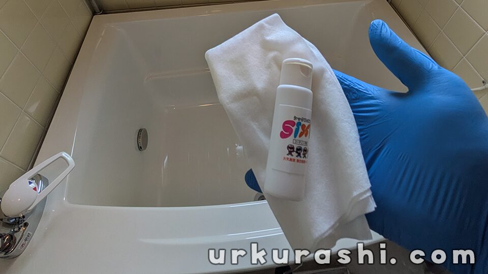 浴槽は面ごとにエリアを区切って順次進めるとスムーズです。面積が広いため、液剤の継ぎ足しを忘れずに手早く行いましょう。