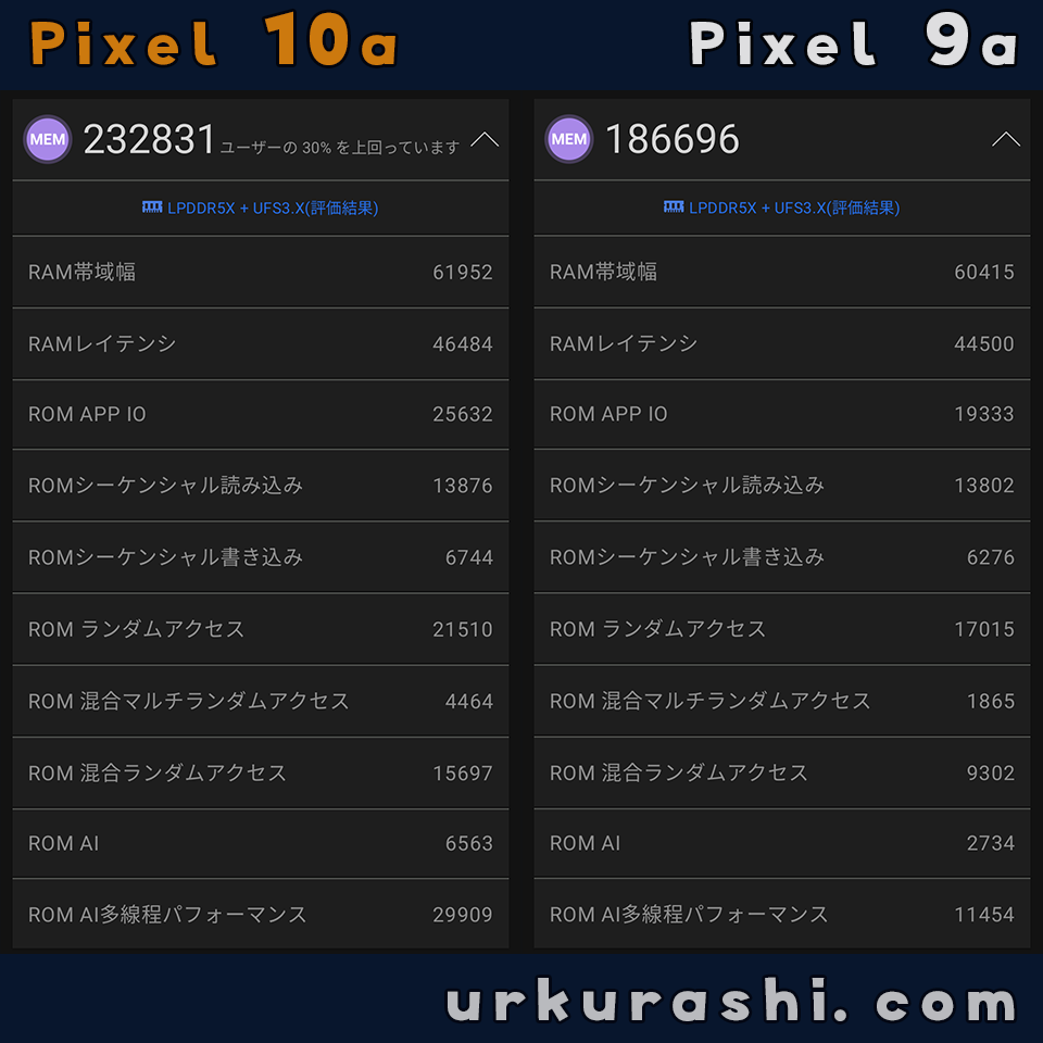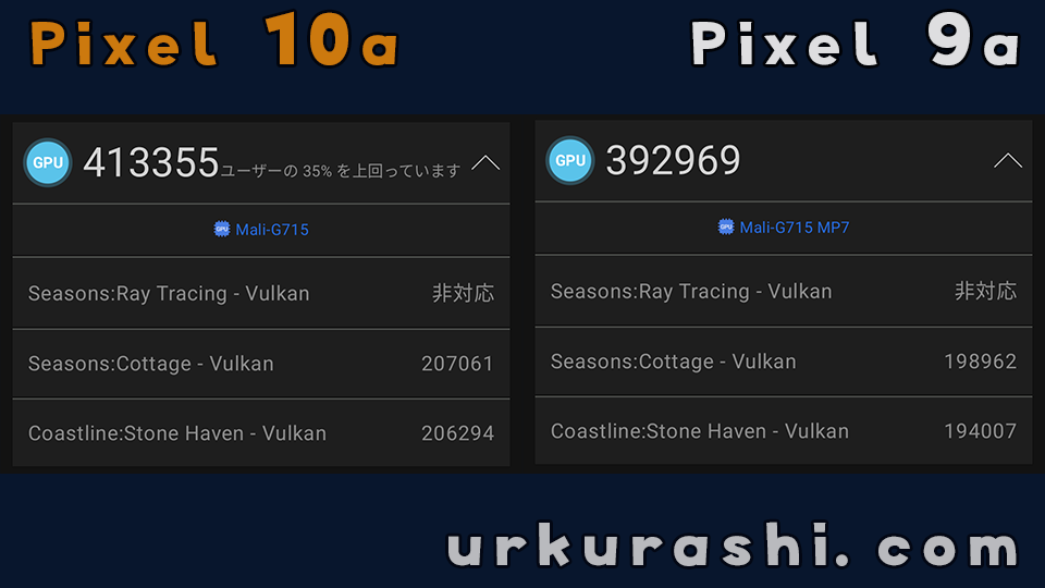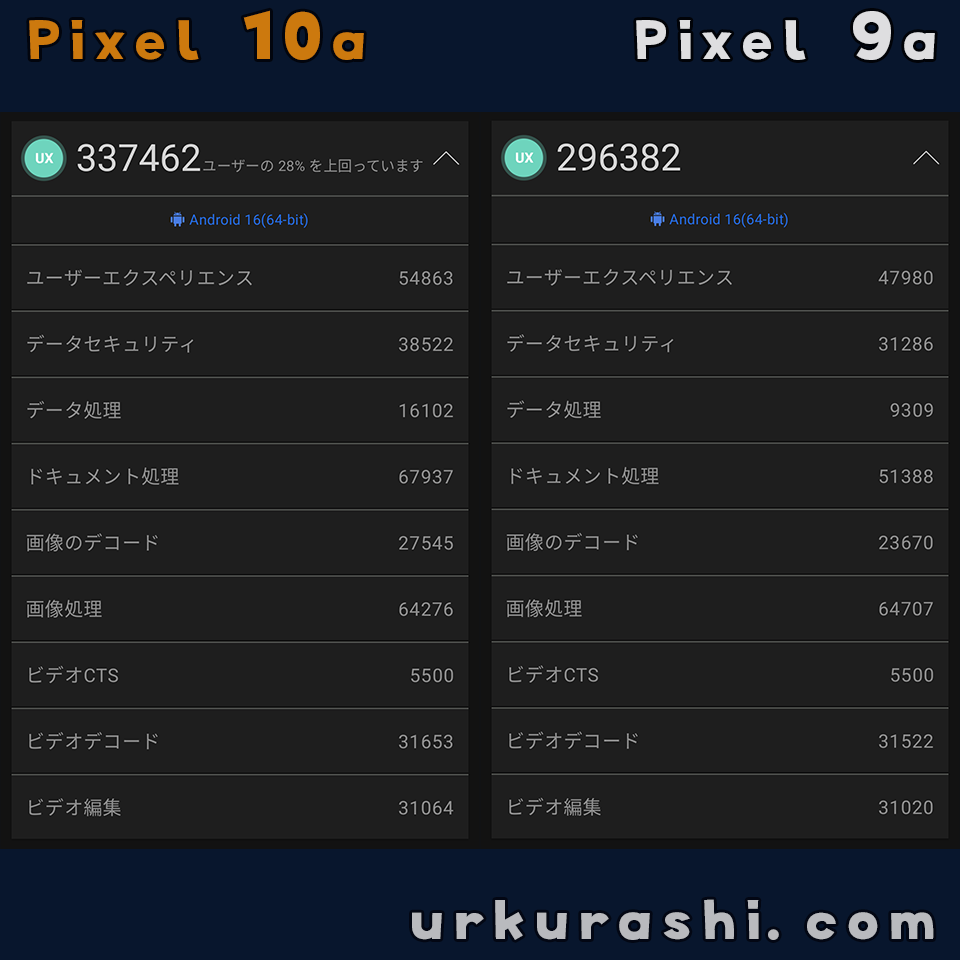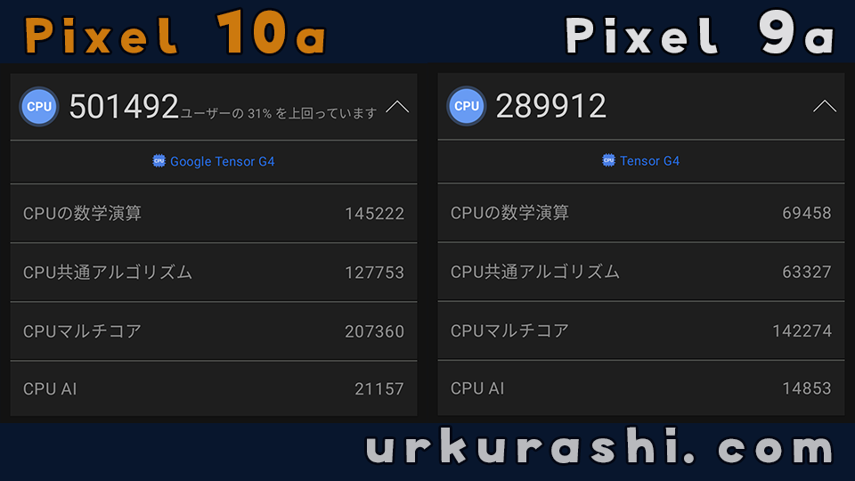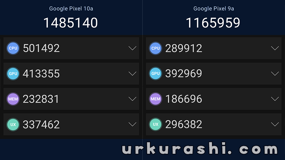 Pixel 10aと9aのAnTuTu Benchmarkの結果を比較します。ストレージ容量はどちらも128GBモデルです。