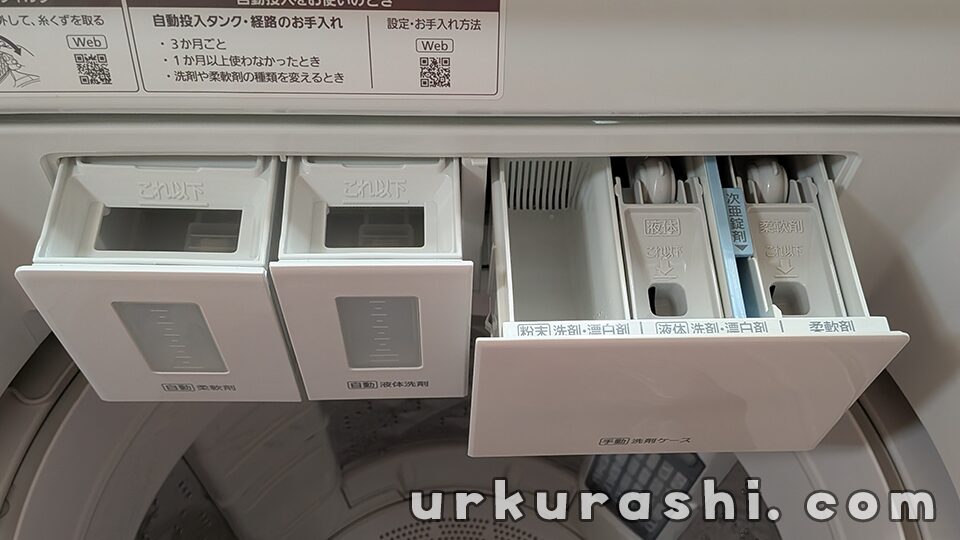 洗剤の投入口については、左側が自動投入用のタンクで右側が手動で都度投入する場所です。
