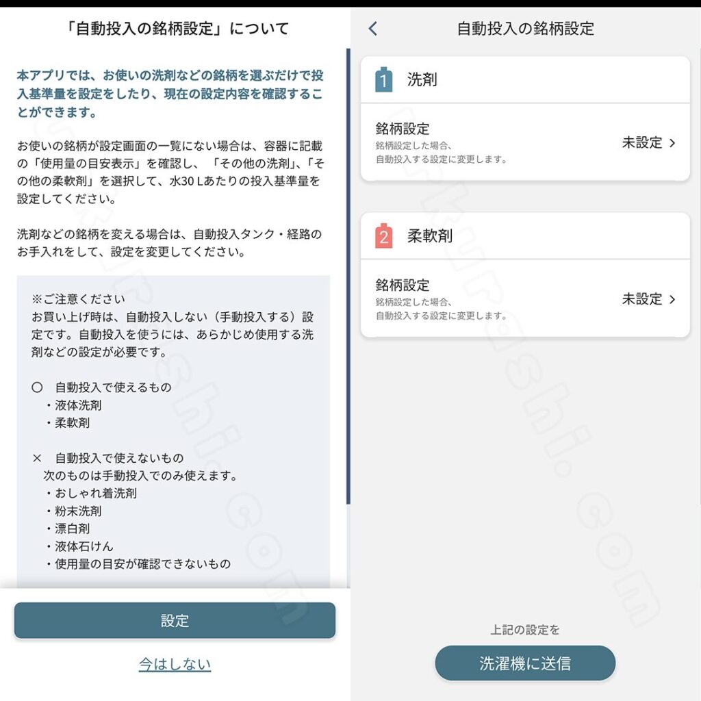 自動投入を使用する場合は洗剤と柔軟剤の銘柄設定を行います。