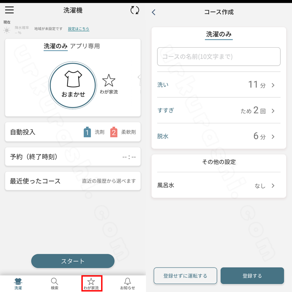 「わが家流」タブから時間を細かく設定してオリジナルの洗濯コースを作成することが可能です。