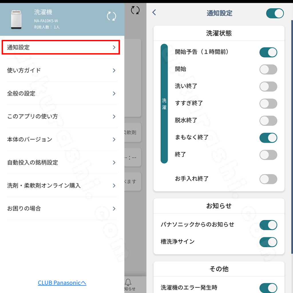 アプリのメニューから「通知設定」を有効にすることで、洗濯の終了時やエラー発生時にスマホで通知を受け取ることができます。