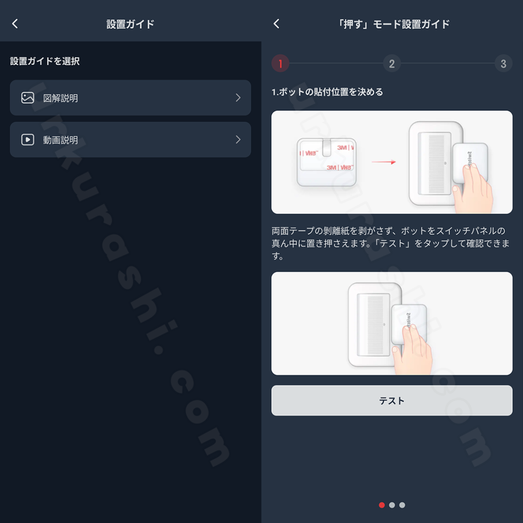 両面テープの保護シールを剥がす前に、養生テープなどでボットを設置予定場所に固定し、アプリから「テスト」を実行します。アームがしっかりとボタンを押し込めているか、位置はずれていないかを確認しましょう。
