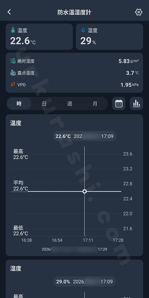 他のセンサー類と同様にこれまでの温度と湿度の検知結果を、アプリ上でグラフとして可視化して確認できます。