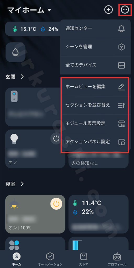 右上のメニューアイコンから編集モードに入り、機器の表示順や、部屋ごとの表示設定を変更できます。