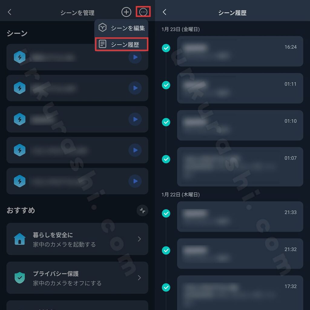 また、シーンの実行履歴も同メニューから確認できます。