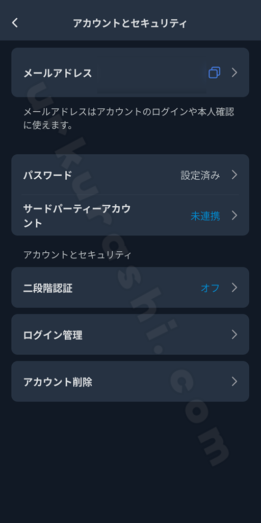 現在のアカウントの確認、登録メールアドレスやパスワードの変更が行えます。