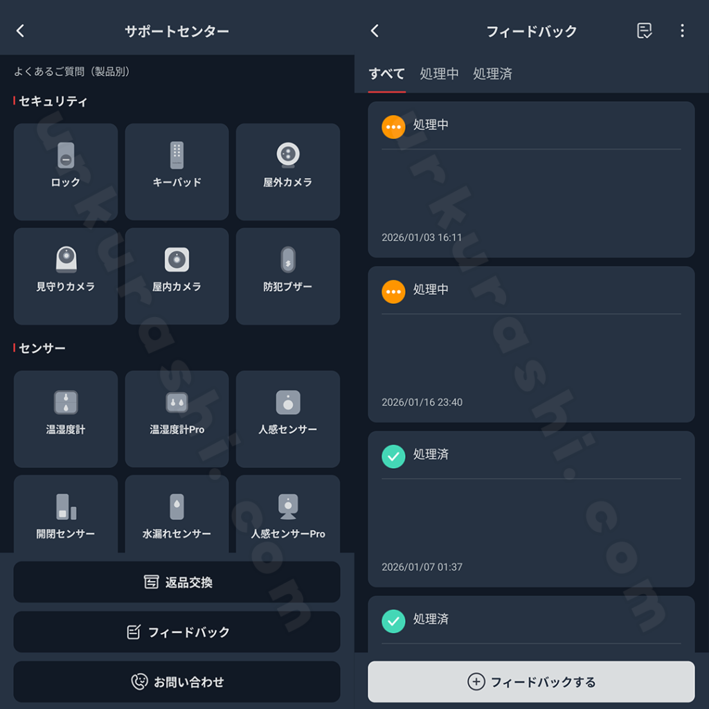 FAQの閲覧や問い合わせが可能です。不具合発生時は「フィードバック」から連絡すると、ログや画像の送信がスムーズで、対応履歴も管理しやすいためおすすめです。