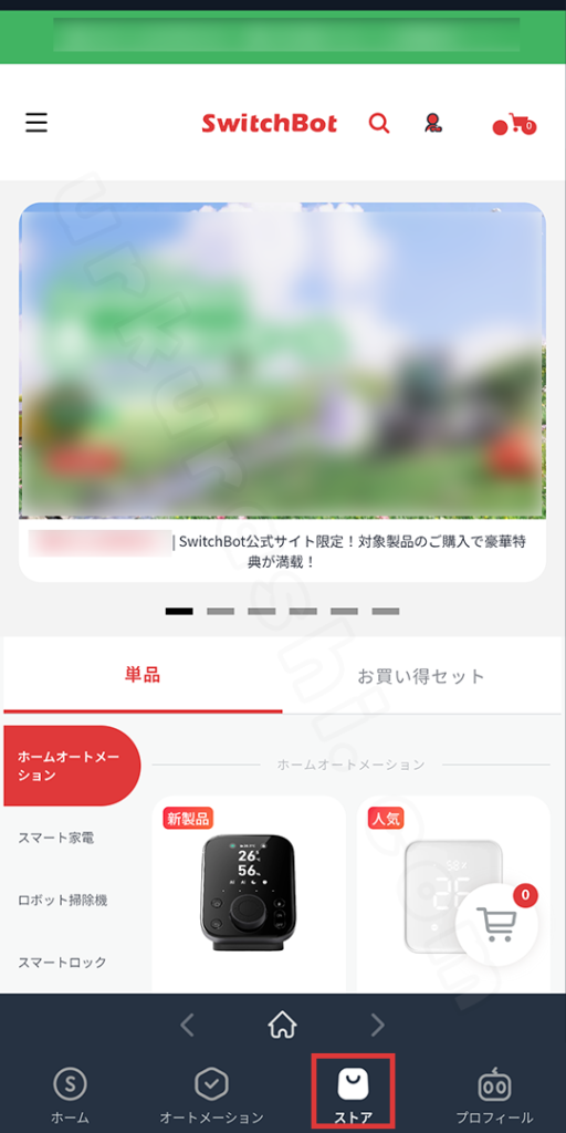 画面下部の「ストア」タブからは、SwitchBot公式ストアへアクセスできます。ログイン状態が維持されているため、スムーズに機器の追加購入が可能です。