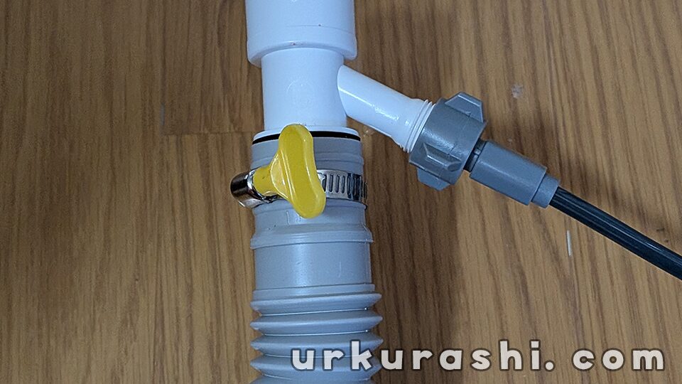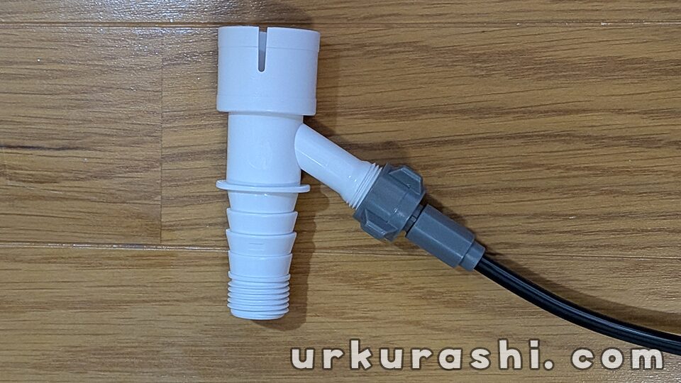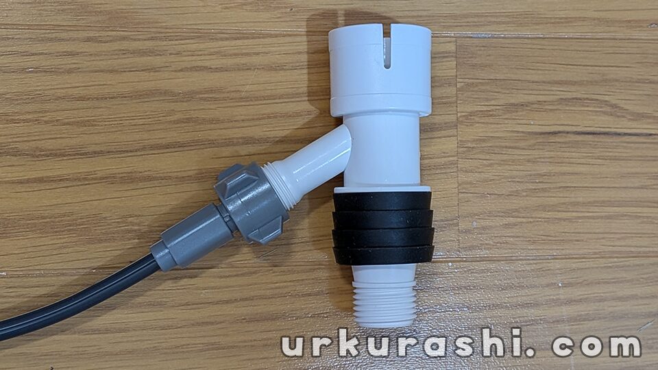 水交換ステーションの排水ホース(黒いホース)の先端にジョイントパーツを接続します。