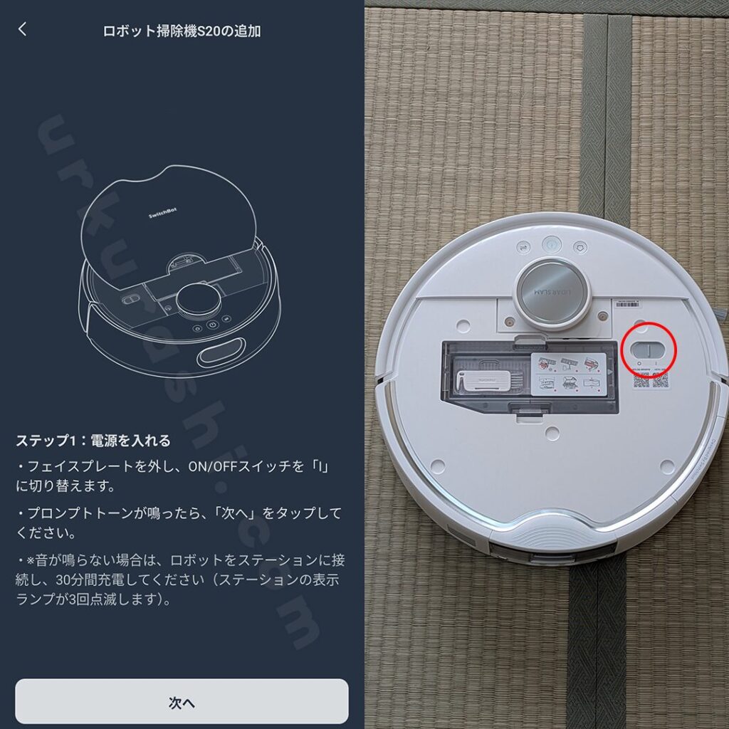 本体の電源を入れます。音が鳴ったら「次へ」をタップします。