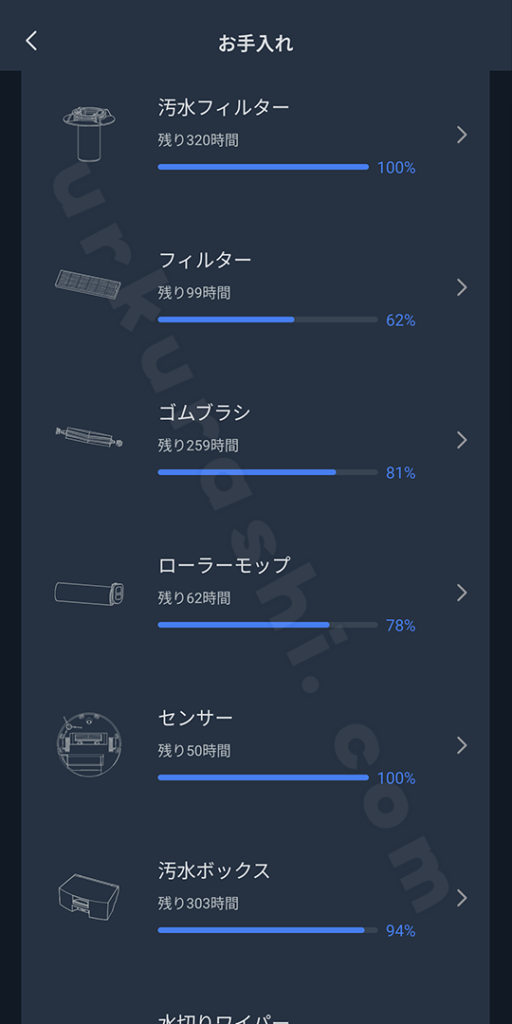 実際に清掃を行った時間をもとに消耗具合が表示されるので、こまめに状態を目視で確認しなくても問題ありません。