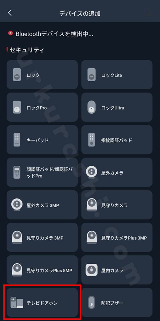 デバイス一覧の「セキュリティ」カテゴリから「テレビドアホン」を選びます。