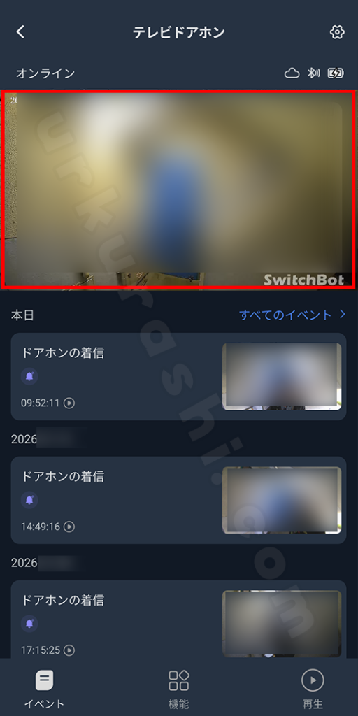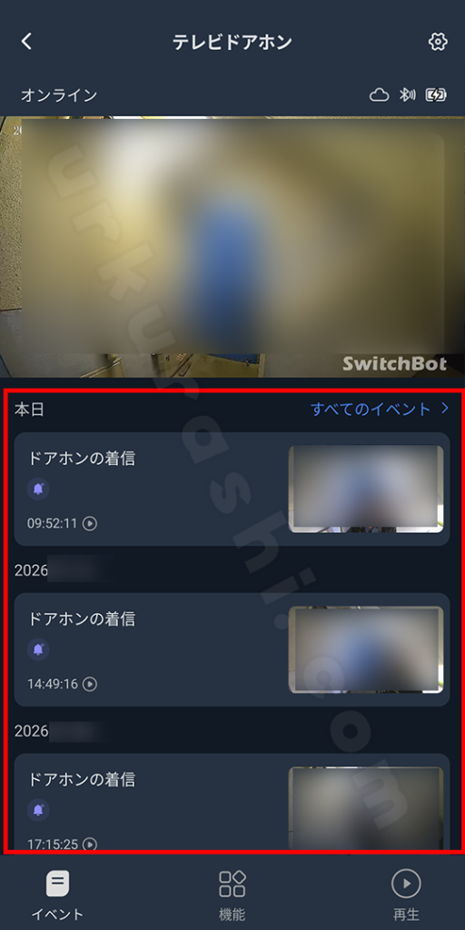 玄関子機のドアベルが押された履歴と録画された映像が後から確認可能です。