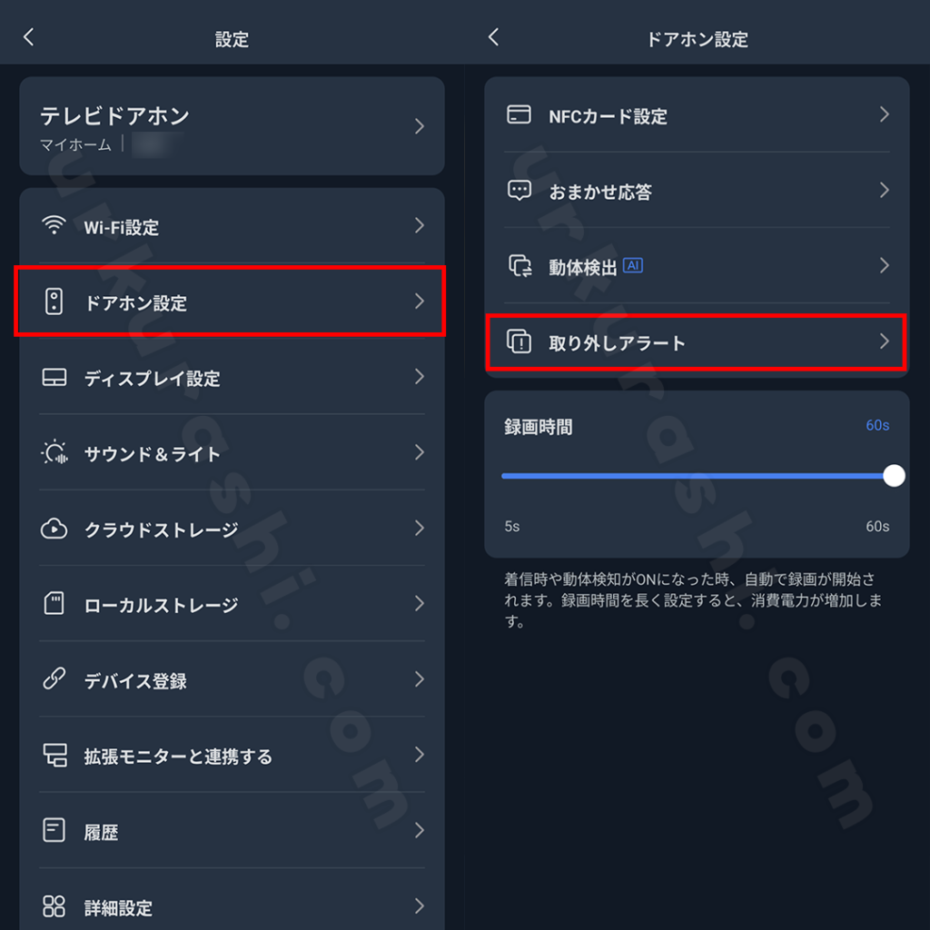 玄関子機を無理に取り外した際に大音量でのアラート音が再生される設定です。