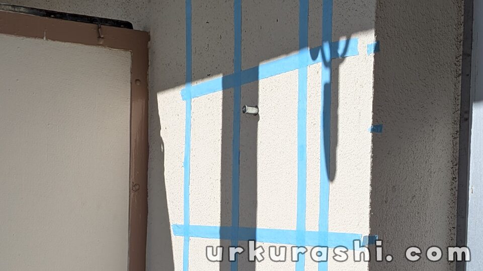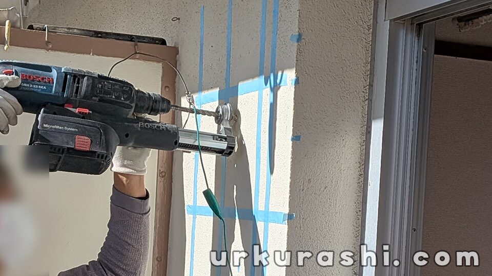 バルコニーに面した側のコンクリート壁に穴をあけ、配管を通すためのスリーブを設置する工事です。