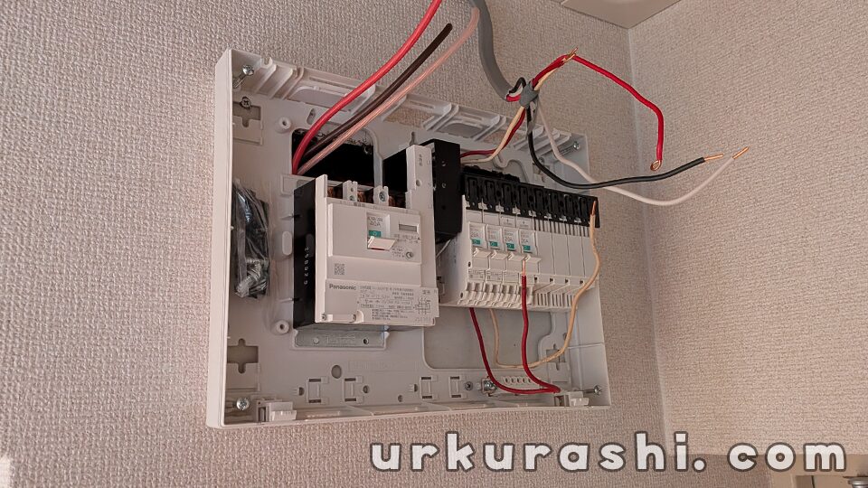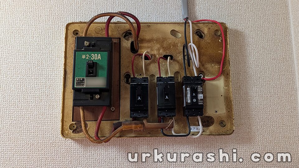 入居時は30Aのブレーカーが設置されていましたが、分電盤自体が非常に古く、本来あるはずのカバーもついていない状態でした。