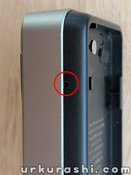 子機側面の穴をピンで押し込むと、ロックが外れ取り外すことができます。
